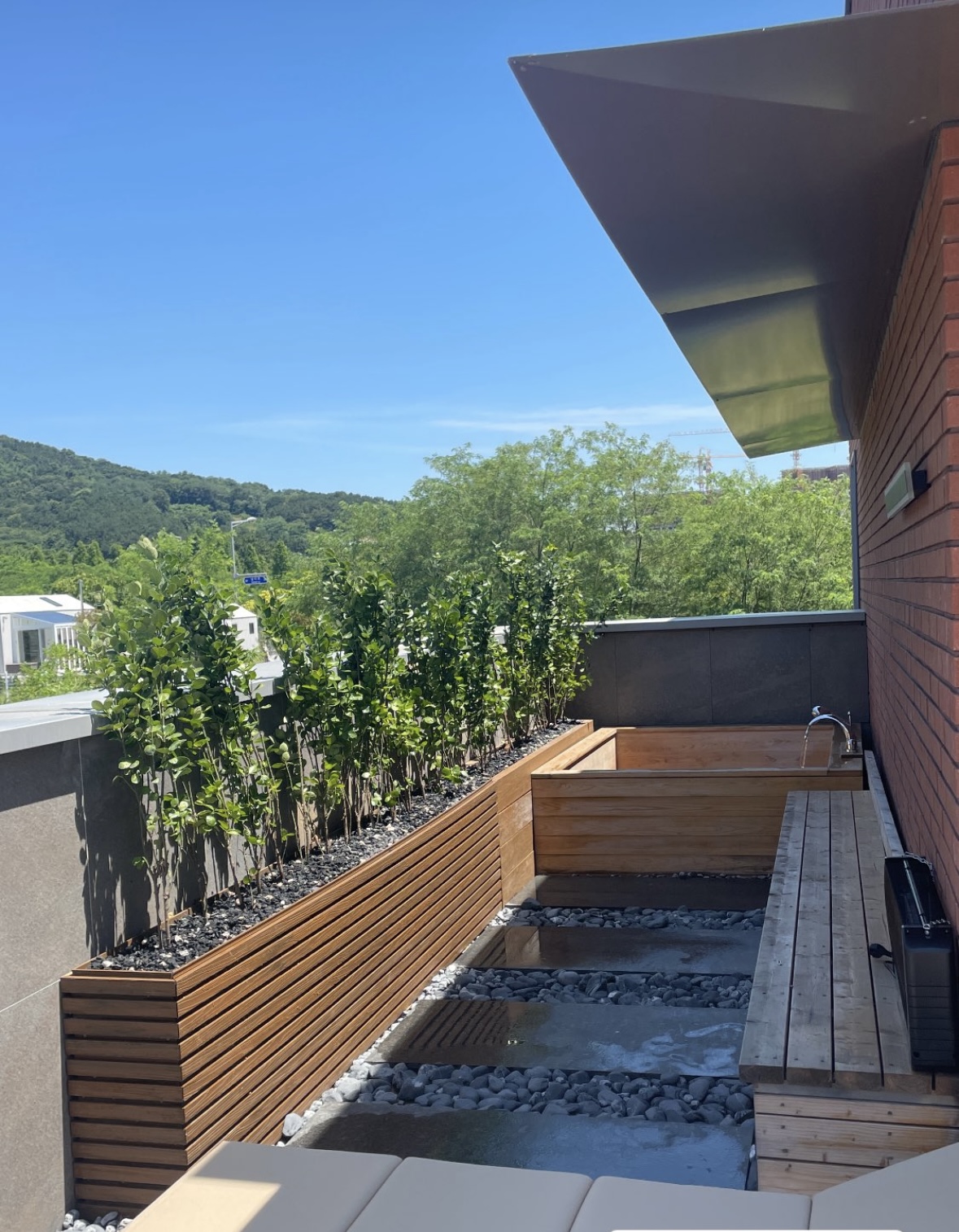 의심이 되는 부분은.. 말씀드린 조적 위에 목재 의자를 만들어 놓으셨는데요. 이 목재틀을 고정하는 과정에서의 방수층 훼손이 있었을 가능성을 보았습니다.