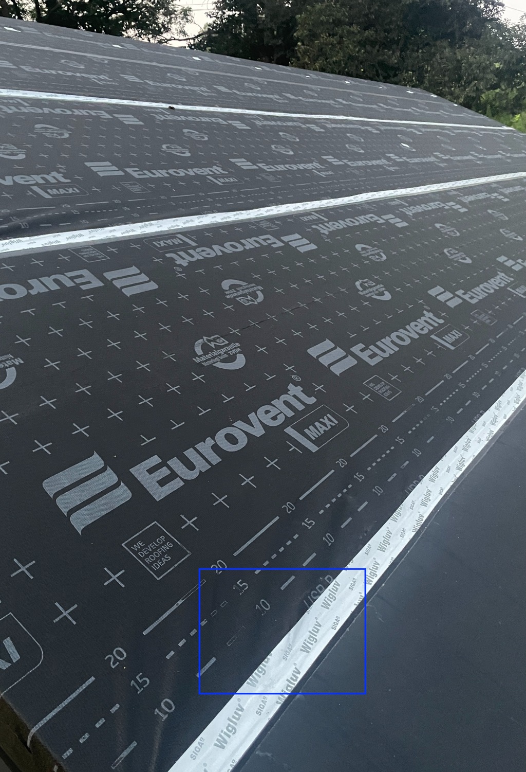 작업은 지붕에 투습방수지 4장이 150미리 겹침 시공되었습니다. 위 3장은 지붕용투습방수지, 마지막단은 오픈조인트용투습방수지입니다. 모두 유로벤트사의 제품입니다. 최초 유로벤트사의 기밀테이프로 겹침부위 기밀 시공을 했는데, 테이프 성능이 만족스럽지 못해 위에 시가사의 테이프를 추가 시공하였습니다.
