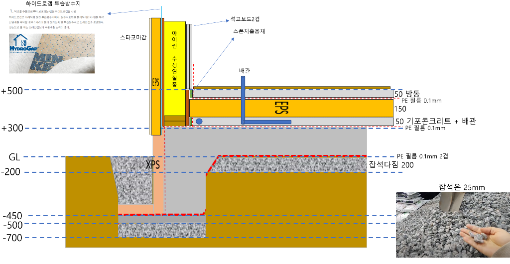 - 기초외부 측면 : XPS 50 단열 (수평,수직) , 잡석으로 되메우기