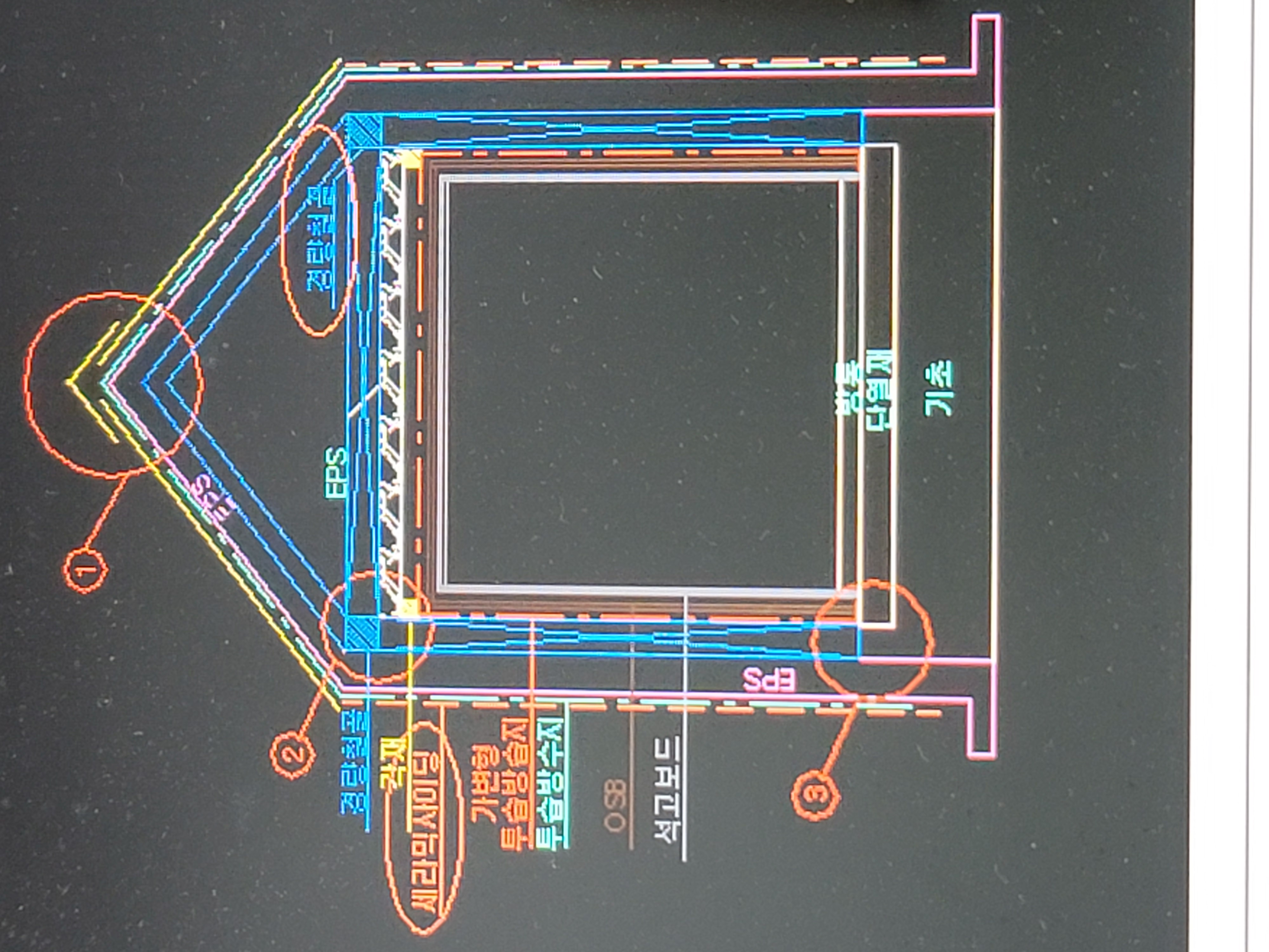 벽의 단열재가 기초 측면까지 내려가서 ㄴ자로 꺽여 수평의 단열재를 설치하도록 그려져 있습니다.