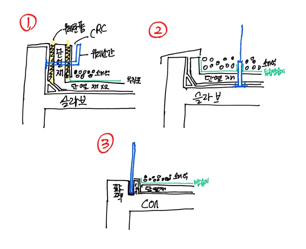 질문1) 1의 그림 처럼 파라펫 측면에 유리 난간 시공할 경우 평철난간 시공과 같은 방법으로 진행하면 되나요? 풍압 때문에 파라펫 옆 단열과 방수층에 균열이 갈 위험이 있을 것 같은데 저기서 더 보완 할 수 있는 방법이 있다면 어떻게 해야할까요
