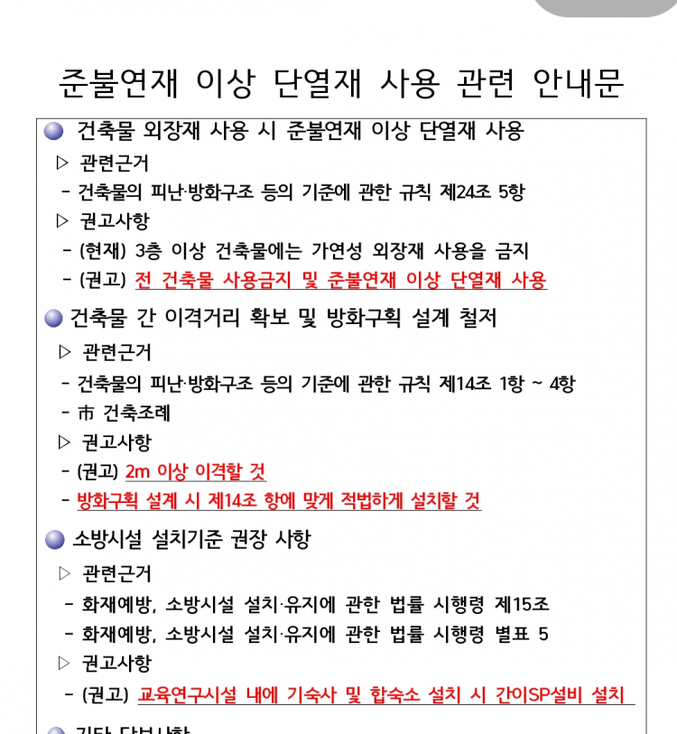 답변 감사드립니다. 가연성 외장재 사용을 금지 & 준불연 이상 단열재 사용 권고라고 된 소방서 공문? 이 있는데, 저건 말그대로 참조 사항으로 건축법 위에 있지는 않지요?