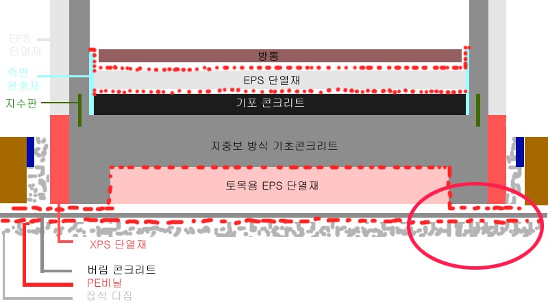 그리고 지중보방식의 기초시 빨강색 원부분에 단열재가 끊기는방식은 어떻게 보완할수가 있을까요?