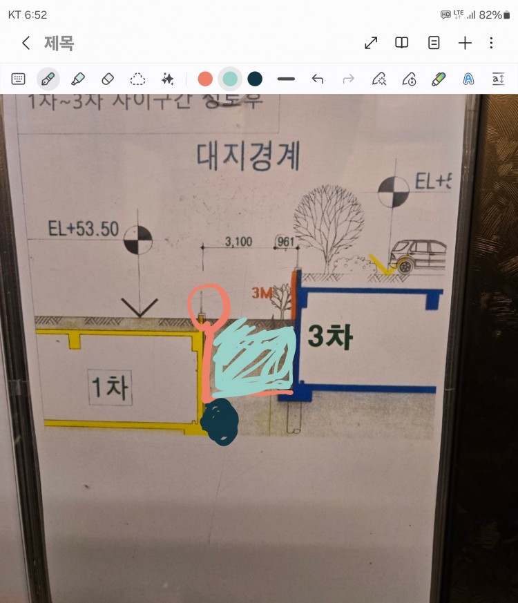 지하층이 라는 이유로 우리 대지경계에서 96cm미터 아파트가 시공 됩니다. 그리고 현재 우리 화단에 휀스을 치고 공사 하고 있습니다.