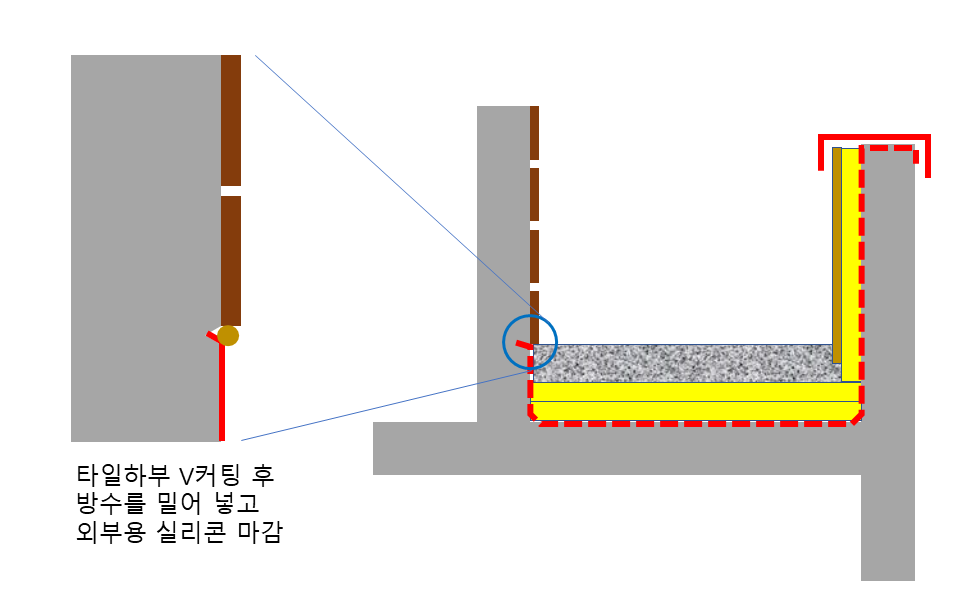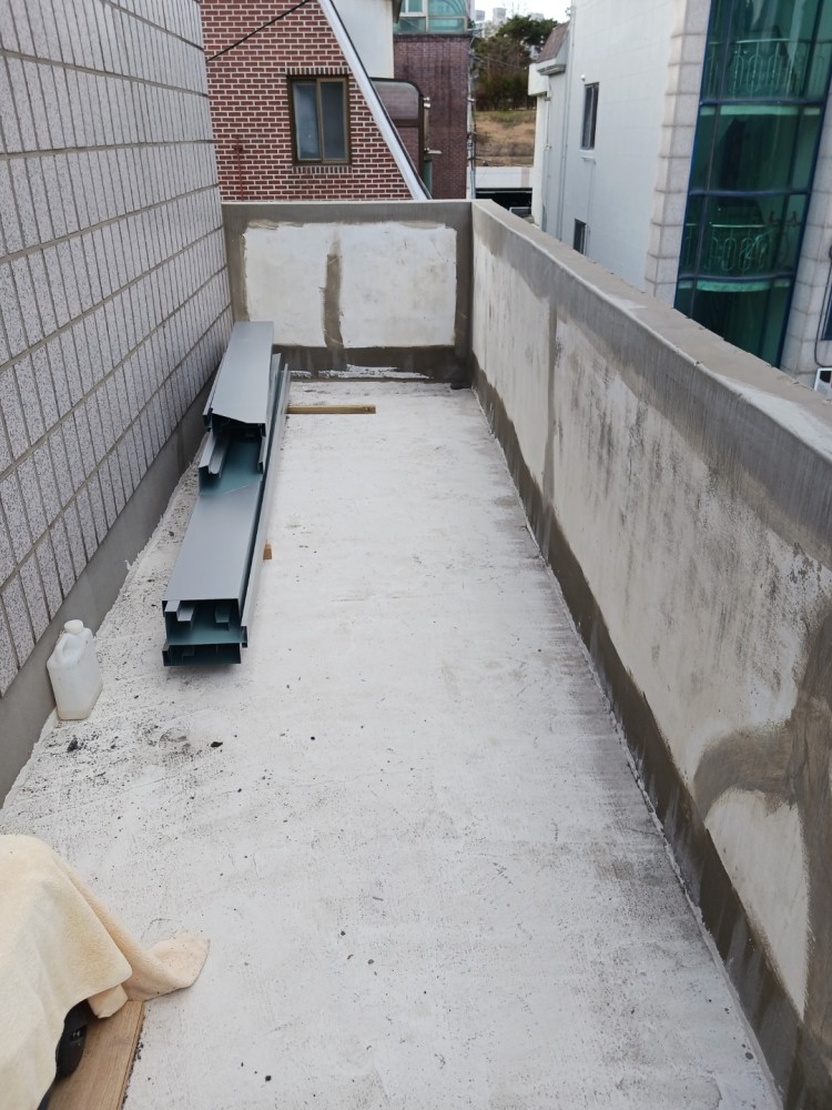 (2)외부의 윗층 베란다에 코너 부터 3m 정도 단열재를 깔고 CRC보드+타일을 붙임. 추가로 베란다의 턱 위에서 벽까지 지붕을 씌워서 방수 문제를 근본적으로 없애버리려고 합니다.