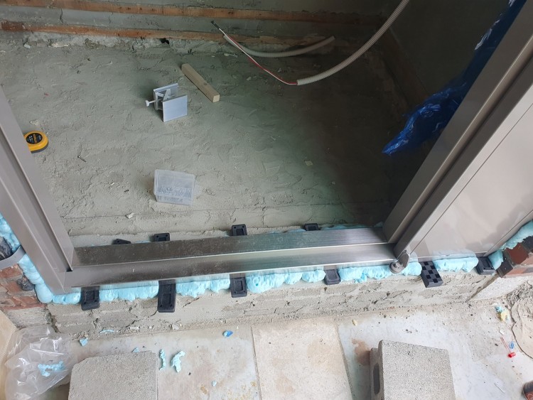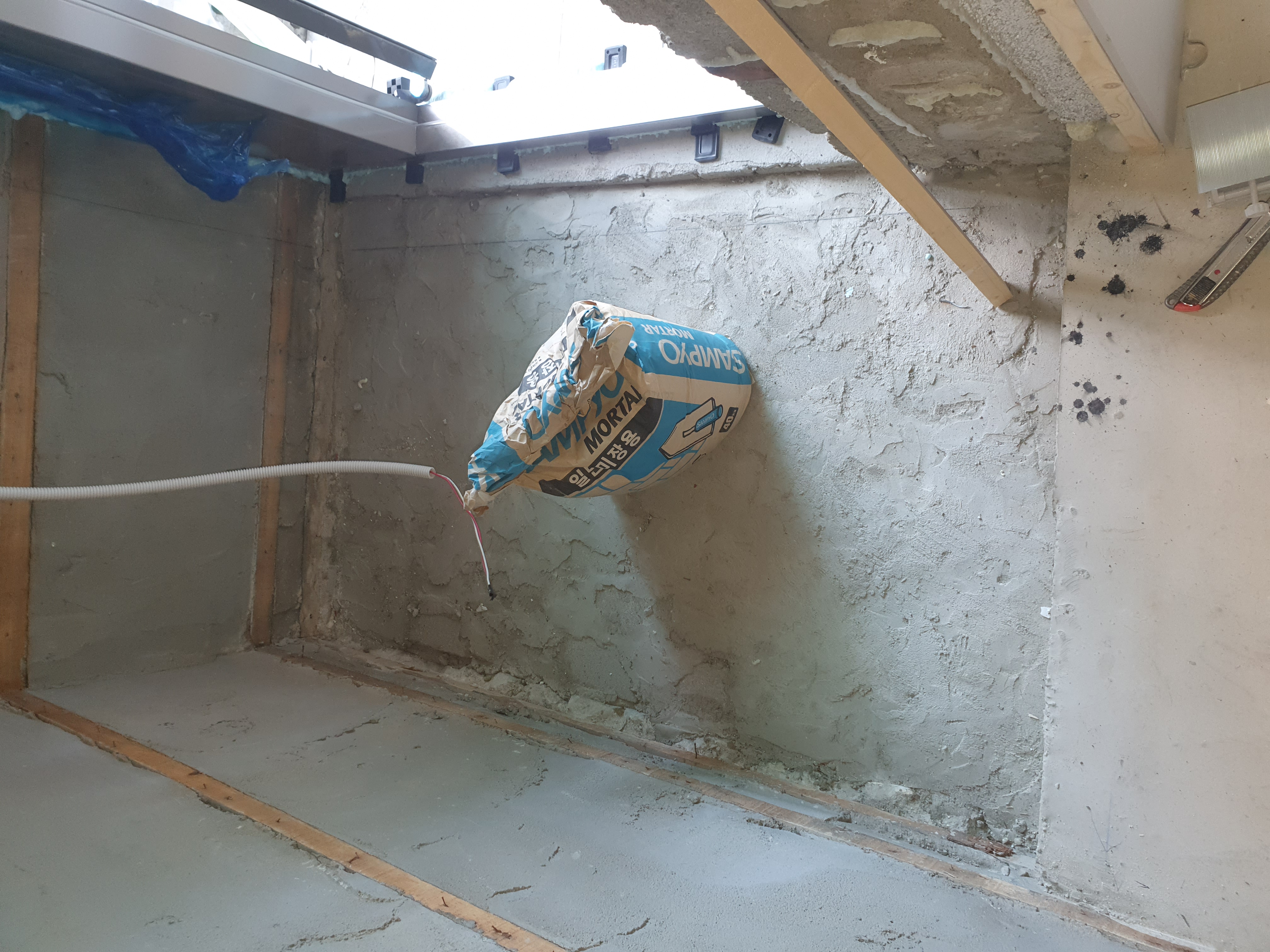 문틀하부는 그래서 우레탄폼이 아닌 단열몰탈에 시멘트를 섞어서 믹싱해서 채웁니다.