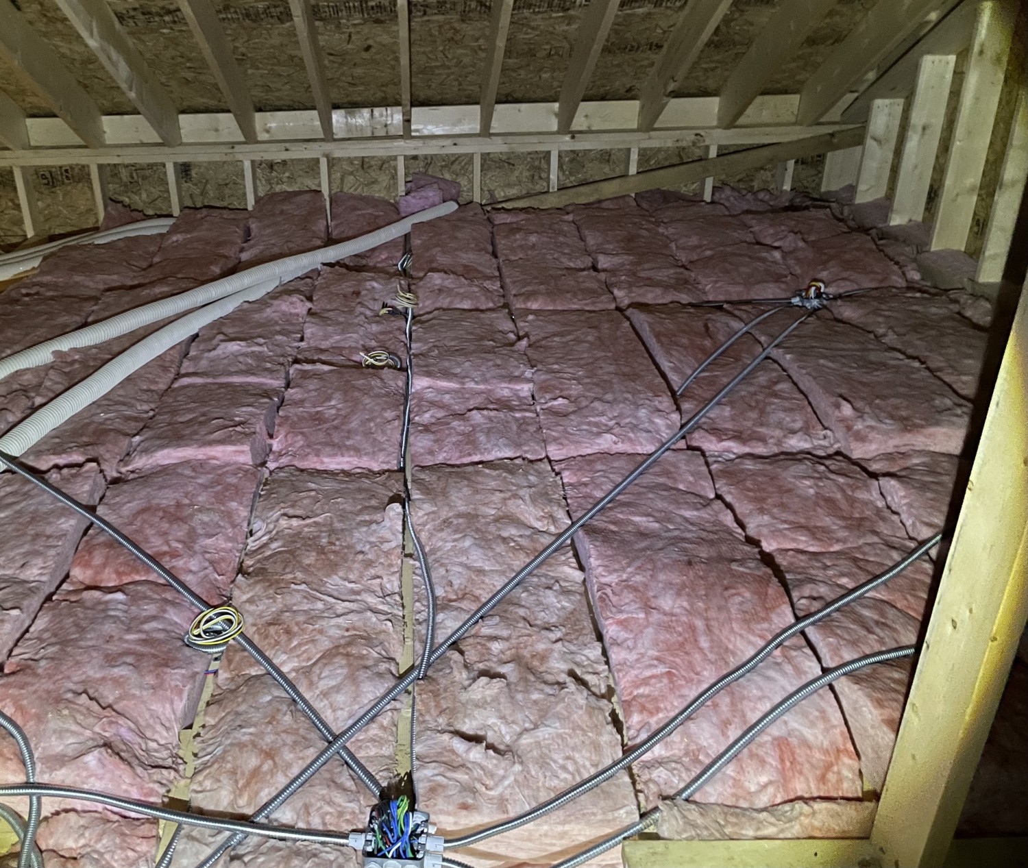 경량 목구조 콜드루프 인슐레이션 시공 상태입니다