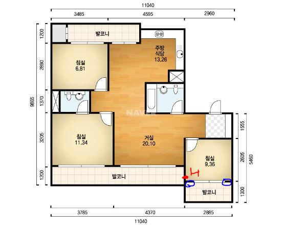 현재 남쪽 작은방은 확장되어있는 상태이고, 따라서 날개벽(파란색 으로 표시한 부분) 은 비내력벽이라 철거되어 없는 상태입니다.