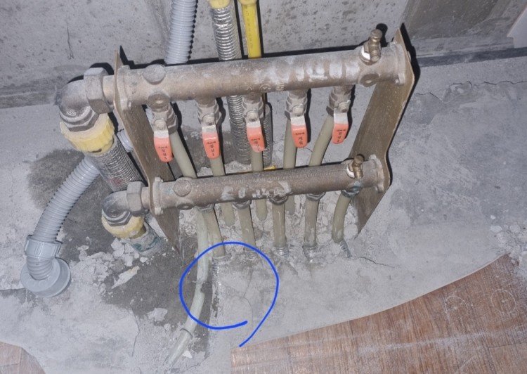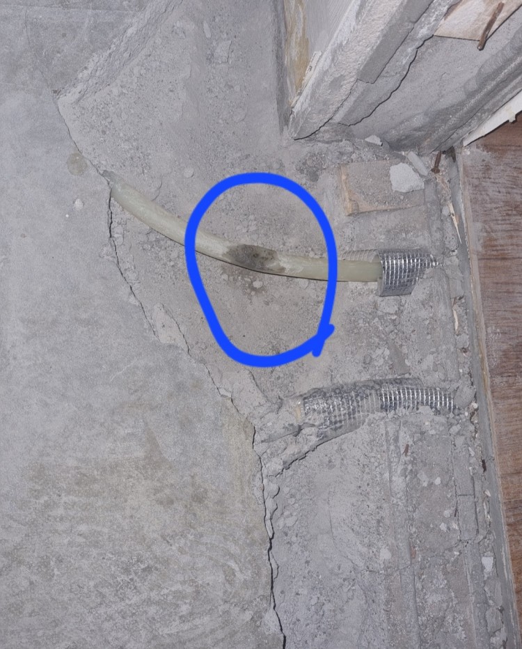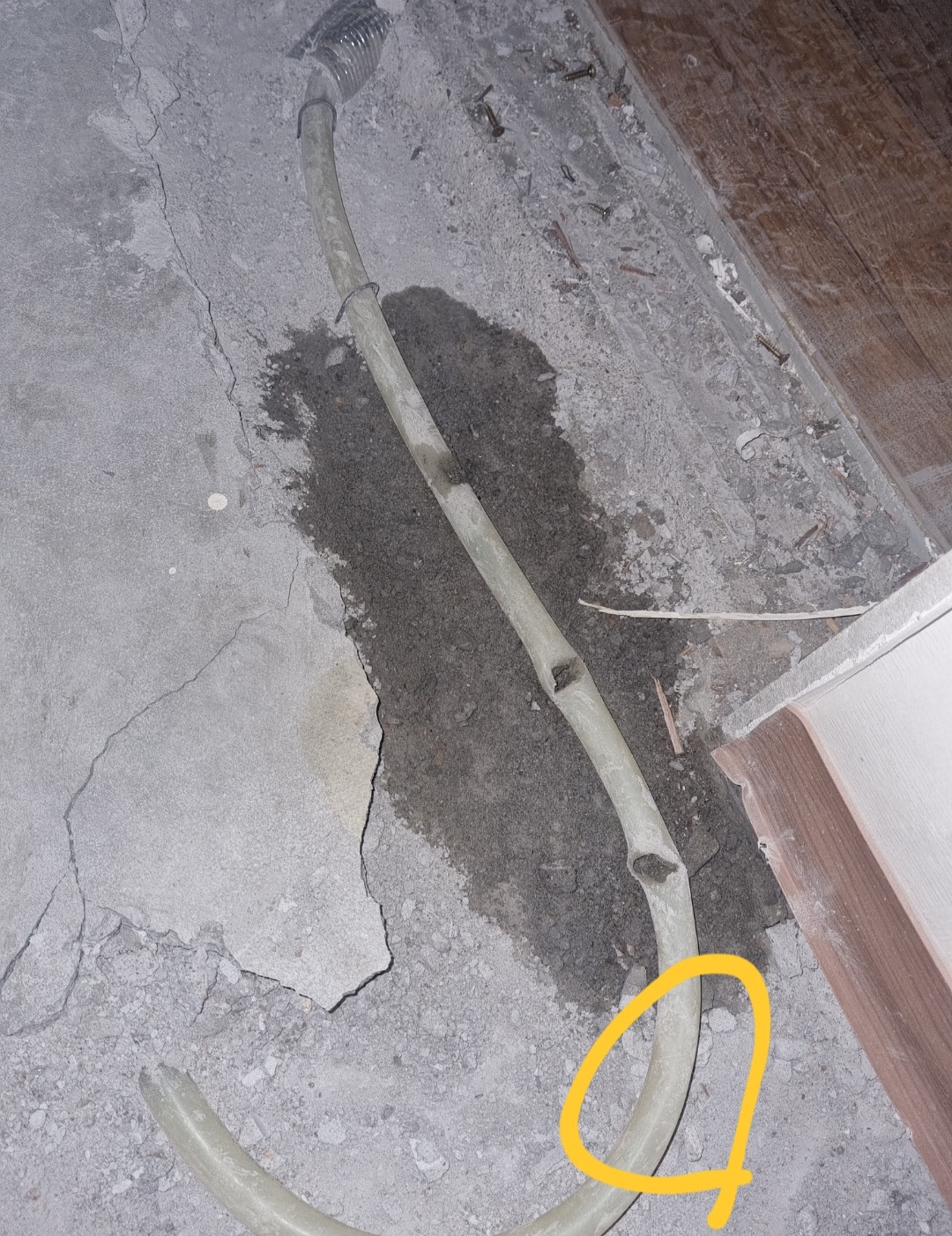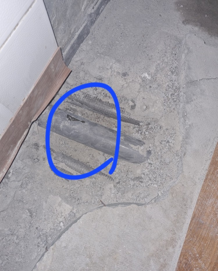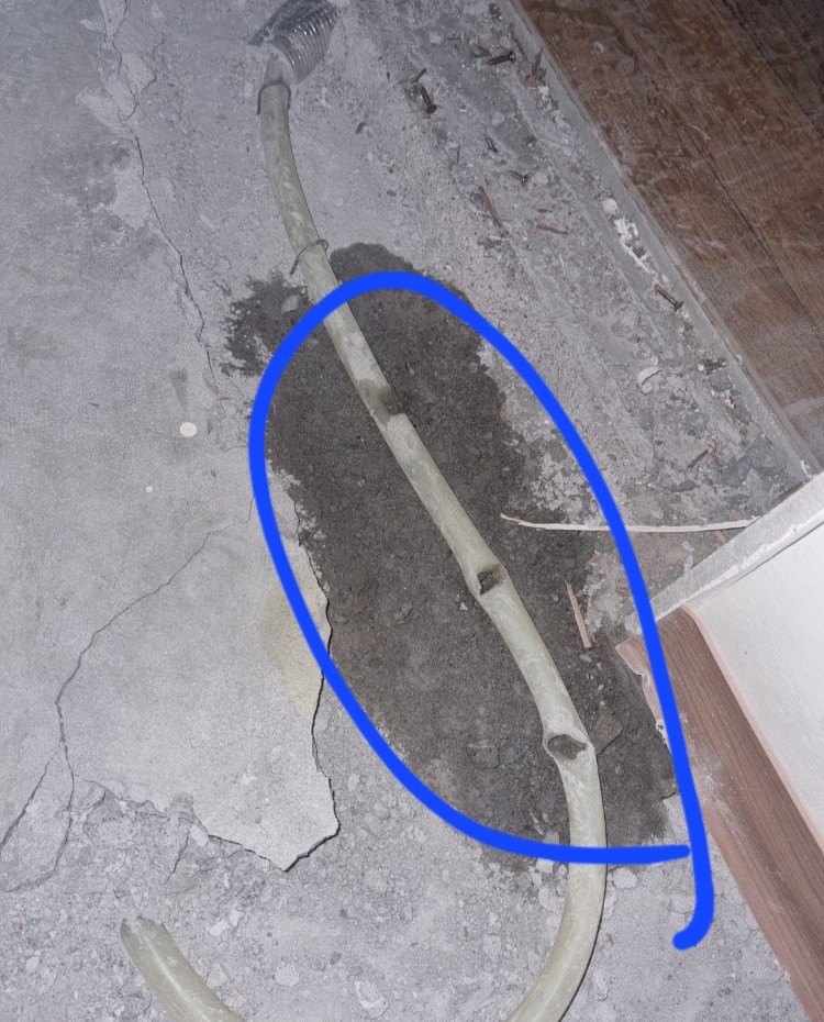 퇴근후 철거 공정 확인차 집에가서 보니 사진속 난방배관에 구멍이 뚫려있습니다. 사진속 회색관도 깨져있어요.