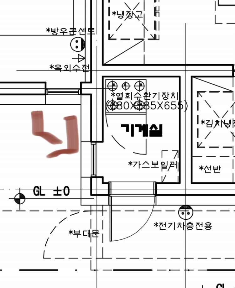 첨부된 도면과 같이 환기장치와 가스보일러가 함께 들어가는 것으로 설계되어 있습니다. (철콘구조 입니다)