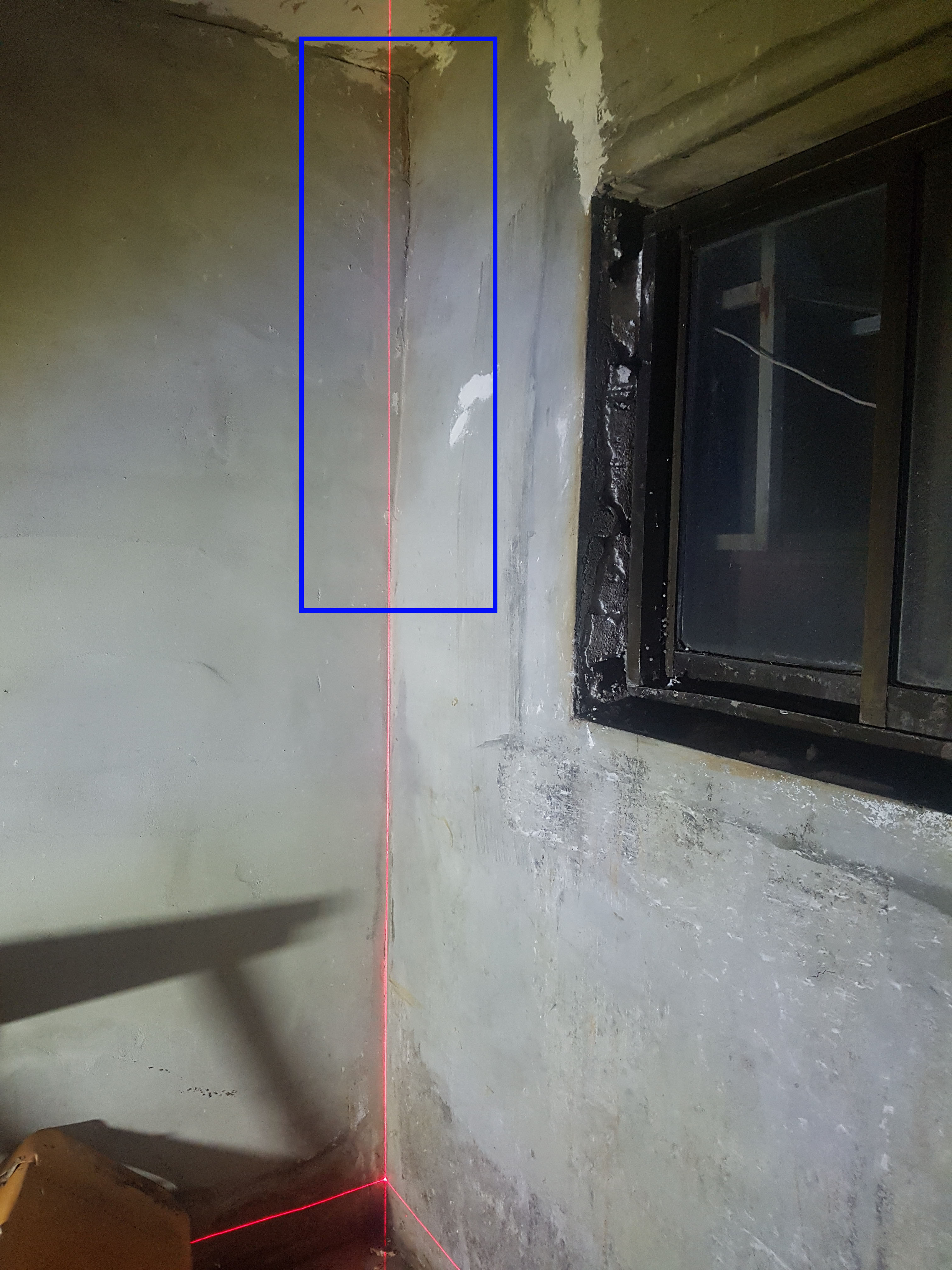 창문을 바라보고 섰을 때 좌측 모서리의 경우 레이저 포인터 기준으로 부터 5Cm가 들어가 있고, 우측 모서리의 경우 레이터 포인터 기준으로 부터 3cm가 들어가 있습니다. 창문쪽 벽면 전체가 위로 갈수록 밖으로 들어가 있는 형태입니다.