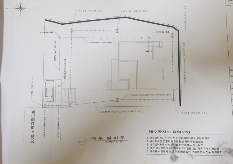 도면은 150mm PVC-VG2 배관으로 표기가 되어 있습니다. 오지랍입니다만, 땅 속에 묻히는 배관은 더 두꺼운 VG1 으로 하는 것이 좋습니다. 다 비용이긴 합니다만...