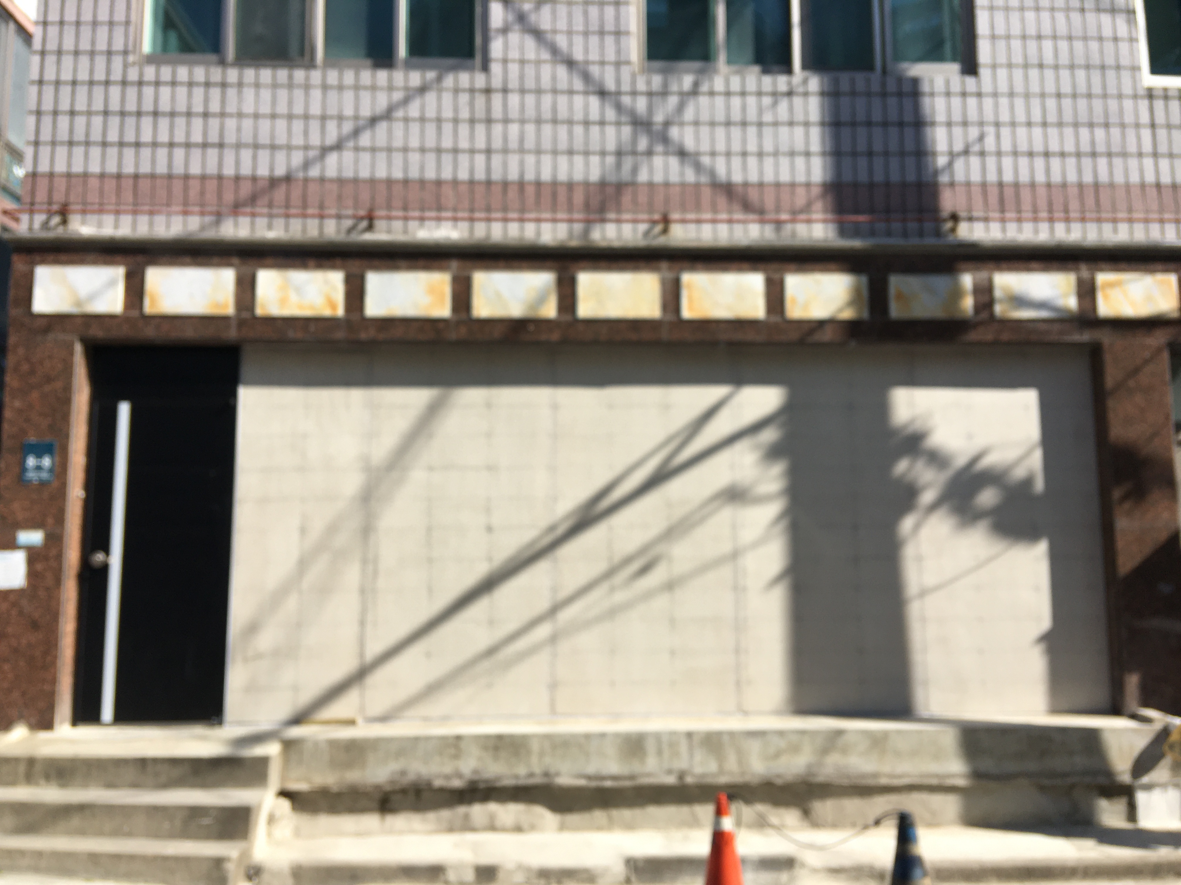 쇼윈도우의 유리를 철거하고 38mm 방부목틀을 스테인레스 샤시를 기둥삼아서 방수합판과 CRC보드의 사이즈에 맞춰서 400mm 또는 420mm 간격으로 시공하고 50mm 그라스울을 2겹으로 채워넣은 다음에 틈새는 연질실리콘으로 매운후에 데크용 스크루를 사용하여 타일시공을 대비하여 200mm 간격을 유지하며 1220*2440mm*11.5t 방수합판을 붙이고 그 위에 8t CRC 보드는 윙스크루(양날스크루)를 사용하여 6mm 줄눈간격으로 스크루의 간격을 200mm로 유지하며 시공을 하였습니다. 줄눈은 다우 MS-704 실리콘을 사용하여 시공을 하였습니다.