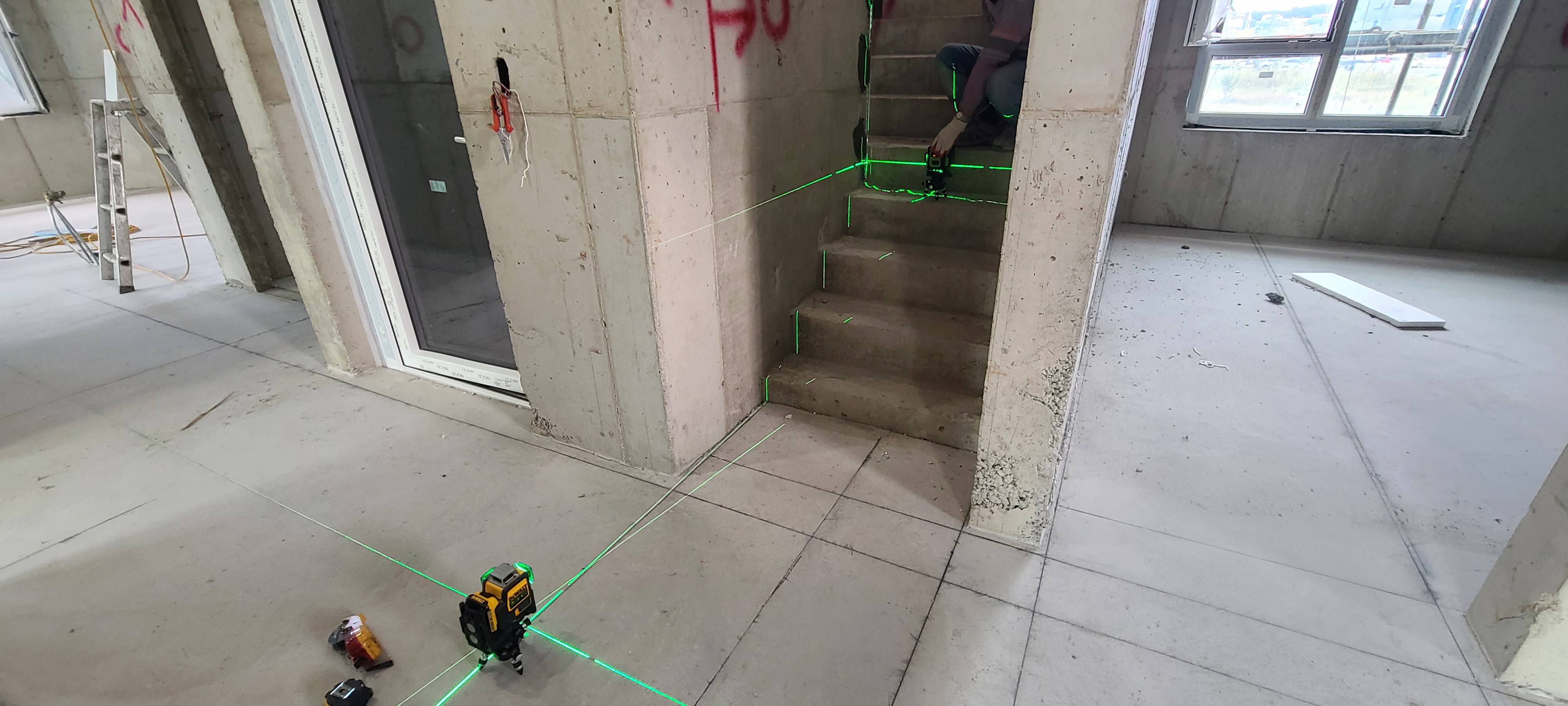 레이저를 띄워놓고 스티로폼을 레이저에 맞춰 붙이고 그 두께로 미장을 하는 것입니다.