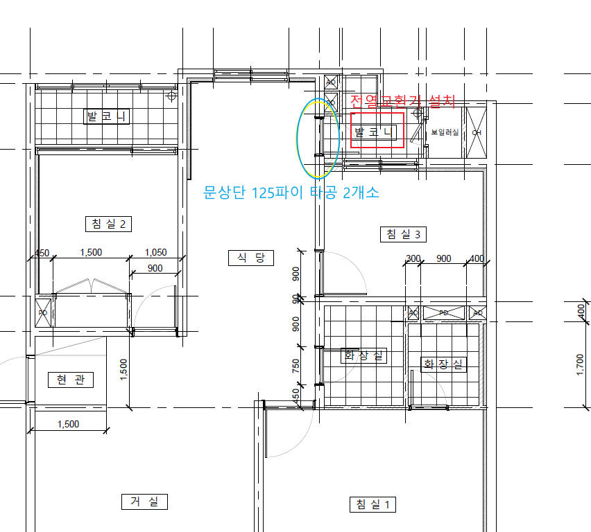 질문 1. 저는 후면 발코니에 설치 예정인데, 단열도어 상부 인방에 125파이 2개구를 타공해도 괜찮을까요? (첨부된 이미지)