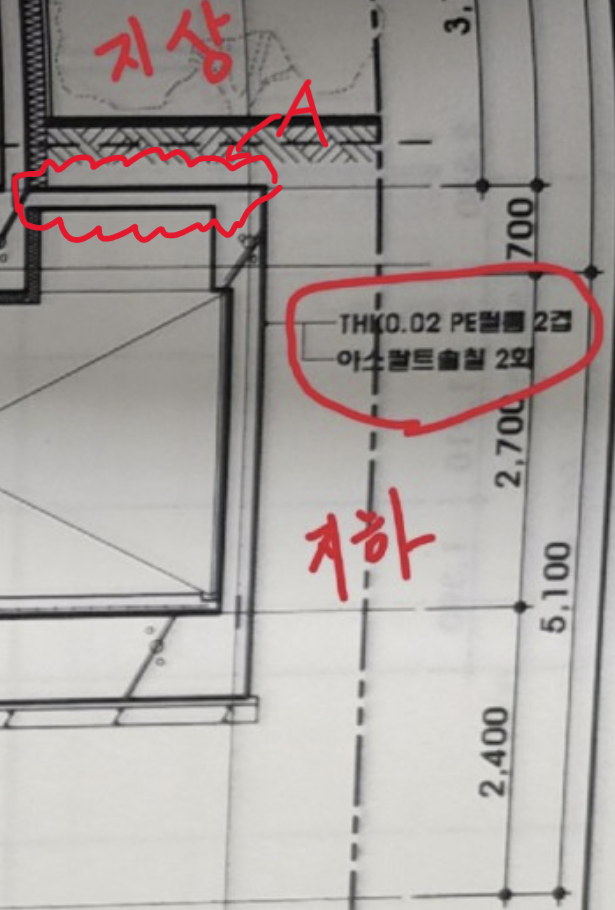 지중에 들어 있는 천장 평슬라브 구간이라함은 "첨부파일의 A부분"을 의미하는 지요? 다시말하면 A부분에 방수가 별도로 기재가 안되어 있고, 지중에 매립되었으므로 이에 적합한 방수가 기입되어야 한다는 뜻이지요? 보통 이런 지중에 매립된 슬라브에는 어떤 방수방법 또는 방수재를 적용하는 지요?