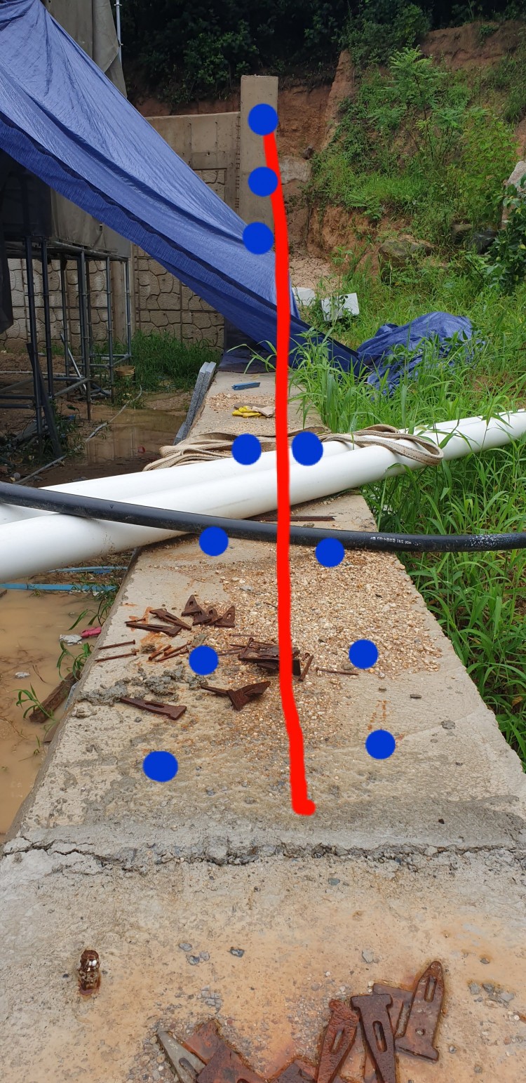 좀 높이고 빨강선 처럼 비스듬하게 하고 파란색 지점에 구멍을 뚫어 철근 심고 공구리 칠까 하는데...이거 보다 더 좋은 방법이 있으면 가르켜 주시면 고맙겠습니다.