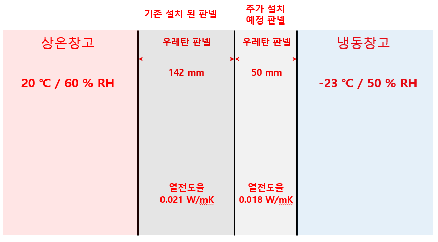 아래와 같은 조건에서 상온 창고 및 냉동 창고 사이에, 두께 (50mm) 및 열전도율 (0.018W/mK) 의 우레탄 판넬을 추가 설치 시 결로 방지가 가능한지 문의 드립니다.