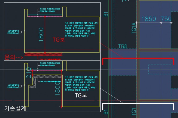 그러나, 위쪽의 슬래브가 아닌 TG보로만 되어있는 구간(빨간글씨)에도 TG보 하부에 단열재를 부착해야하는지 궁금합니다. (단열시점에서 1000mm까지 연장시공할것 이라고 적혀있지만.. TG보는 1800mm입니다..)