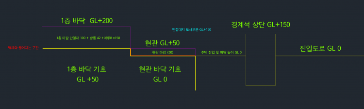1FL 높이가 GL+200 규제 때문에 기초를 대지경계에 있는 경계석보다 -100mm 낮게 친것입니다.