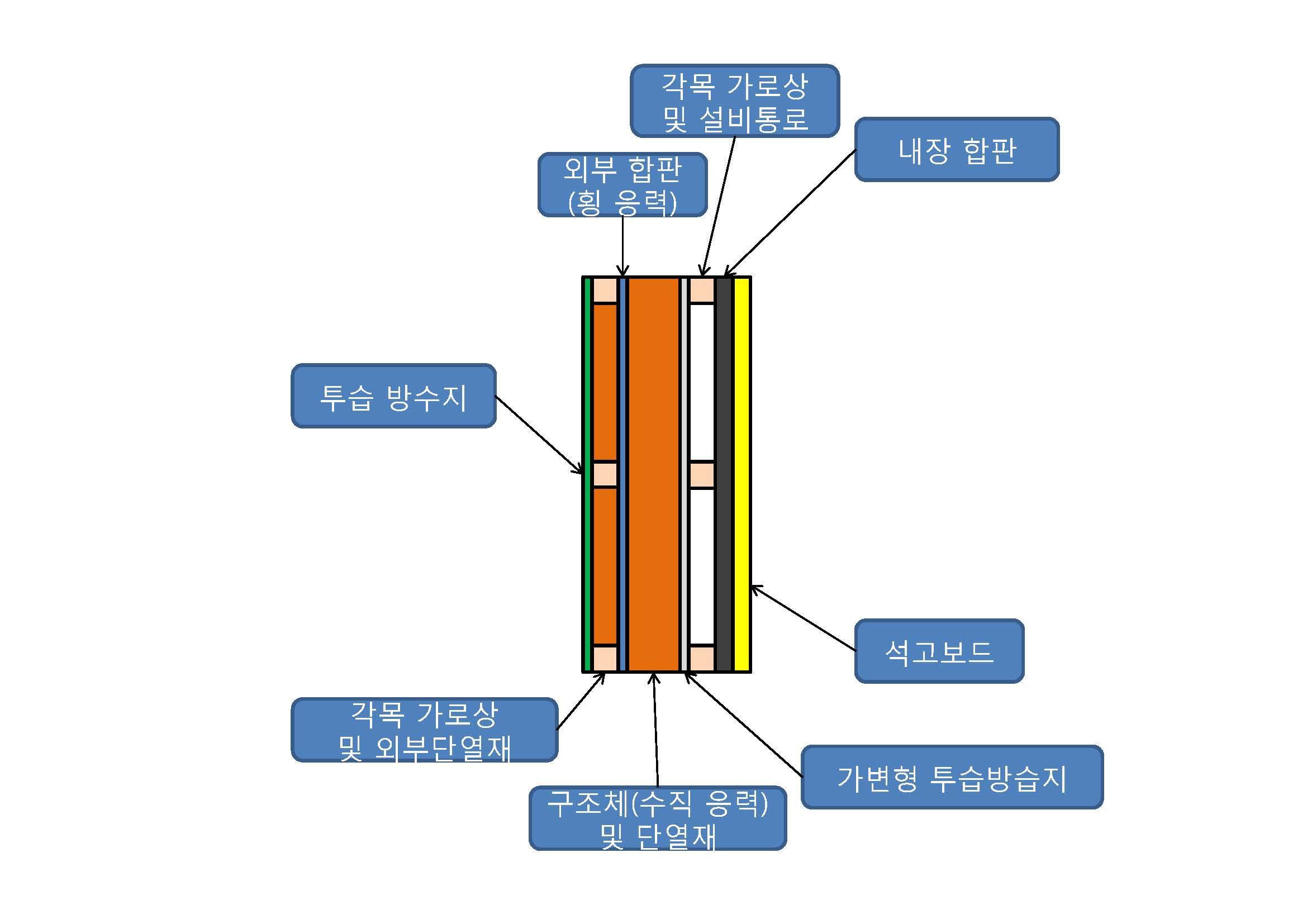 우리나라 특성상 계절에 따라서 비교를 해보자면 여름은 외부 -> 내부 쪽으로 습기가 흐르지만 내부의 온도가 결로가 생길만큼 엄청나게 차갑지 않고, 혹여 결로가 생기더라도 내부로 투습되어 들어오니 구조체의 손상은 없을 것으로 보여집니다. 그리고 추가로 열교환장치의 내부 순환 배관관이을 설비 통로쪽(내부 각목 가로상)에 통하게 구조를 설계한다면 여름철에는 거의 문제가 없을 것이라 생각됩니다.