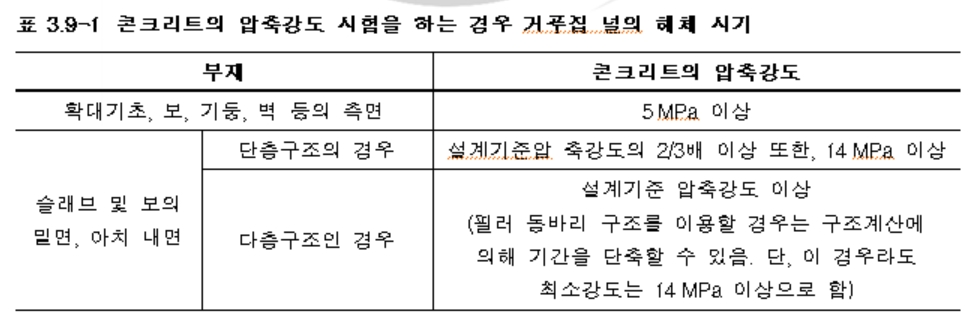 다만 이 것도 위험한 표현인 것이... 강도시험없이 철거 자체가 금지되어 있거든요. 민간에서 강도시험없이 28일을 이야기하고 있고 그래도 별 문제가 없었던 것은... 28일 정도 지나면 (독특한 날씨가 아닌 이상) 대부분 기준 강도에 들어 오기 때문인데... 그래도 강도시험을 하도록 되어 있습니다.