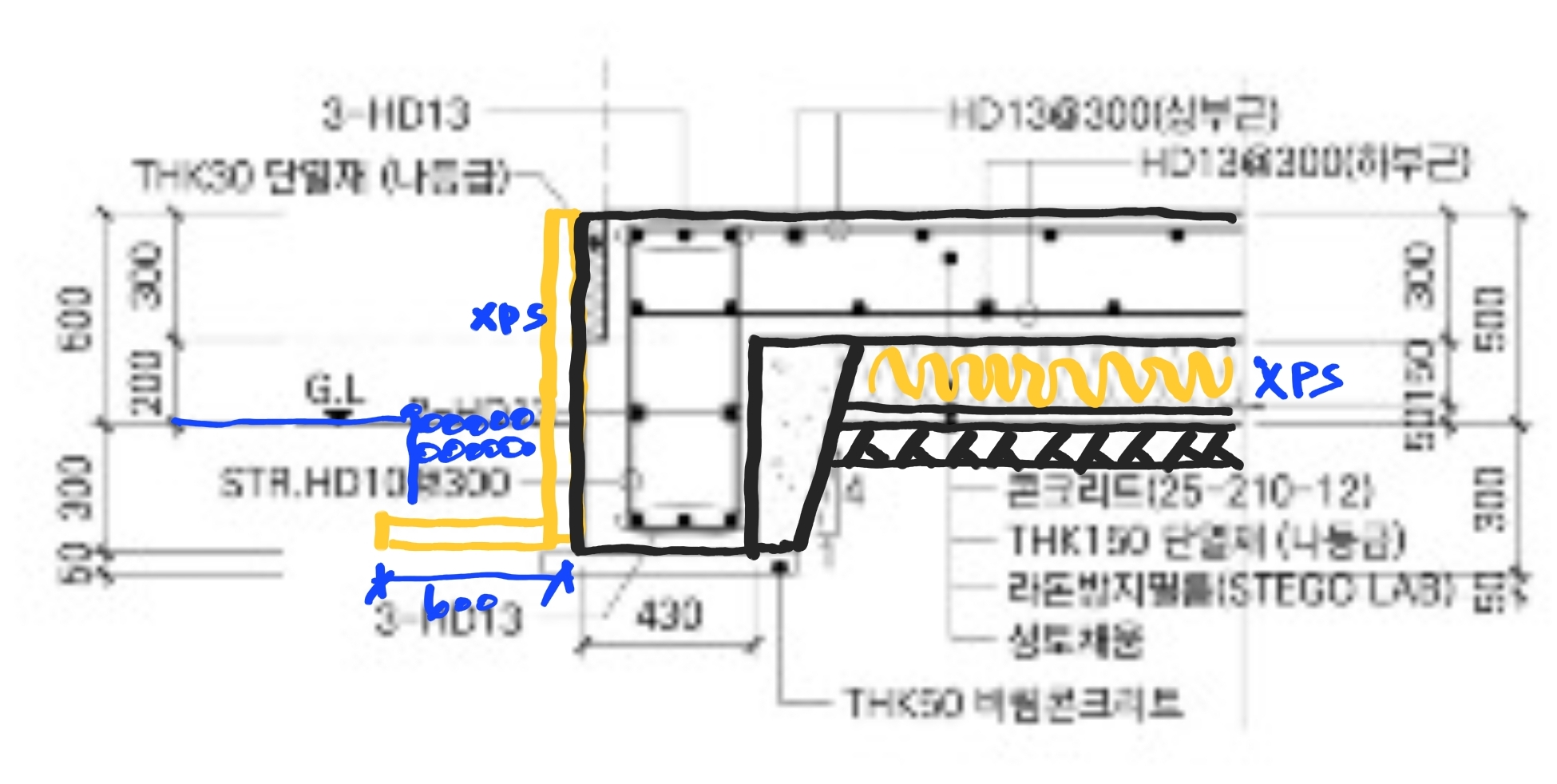 1. 기초가 지면에서 올라가 있으므로, 기초 테두리는 내려가는 것이 맞습니다. 내려가는 깊이는 지면에서 -300mm 는 들어가야 하므로 도면의 깊이가 맞습니다. 다만 측면 단열재가 기초 상부에만 있는 상황이라서 동결심도를 벗어 났나고 보기는 어렵습니다.