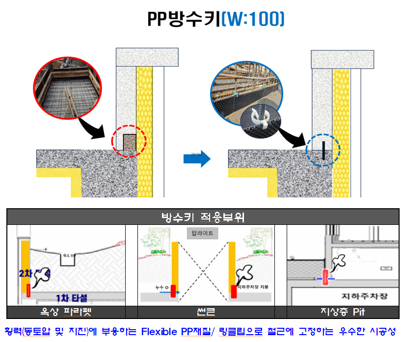 기초를 제외하고 지수판의 적용은 어렵고 수팽창 지수재를 사용하셔야 하며, 방수에 절대적 도움이 됩니다.