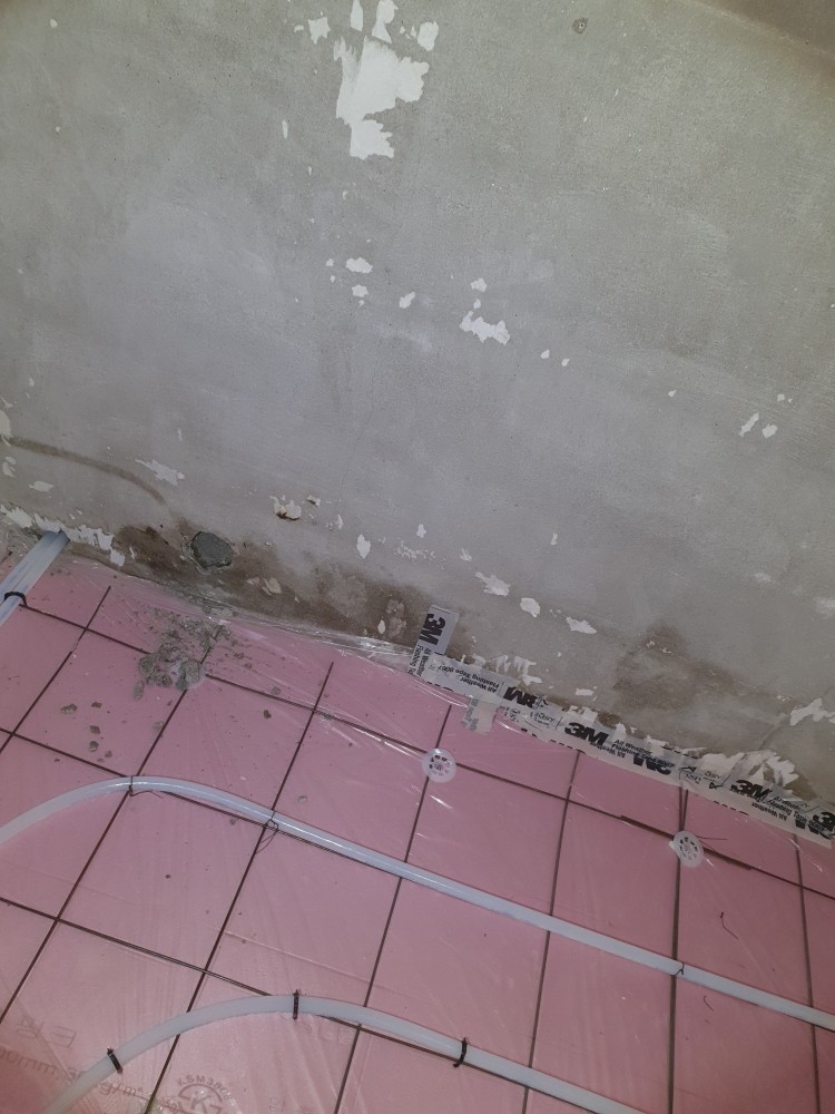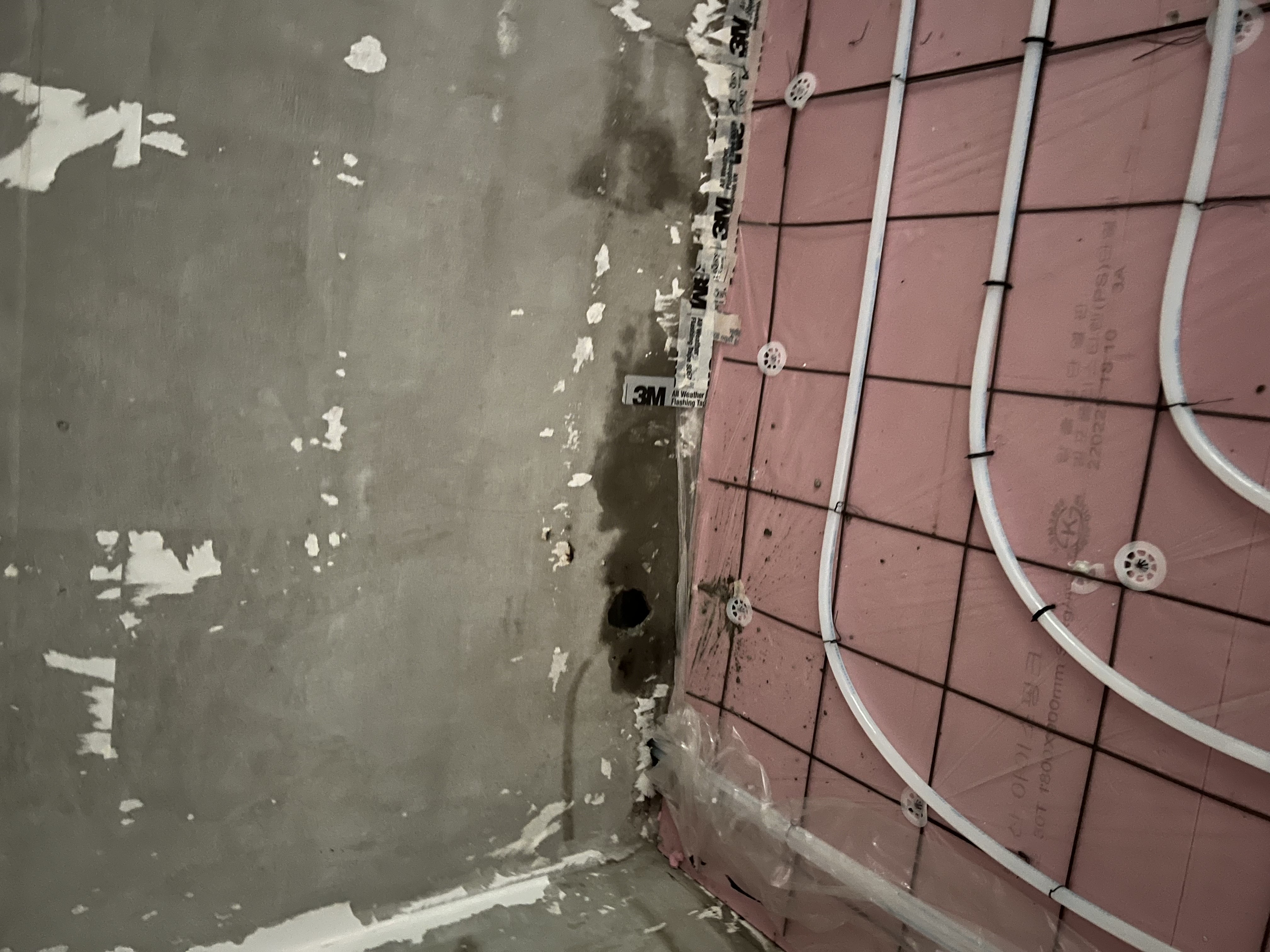 일단 의심이 강하게 들면 배관 가스압력식 누수검사를 해보시길 권해 드리고, 거기서 문제가 없다면 습기로 봐야 하는데.. 이미 단열재까지 깔려 있기에.. 달리 방법은 없어 보이고, 사진의 PE비닐을 연장에서 바닥에서 부터 약 300mm 까지 치켜 올리는 수 밖에는 없어 보입니다.