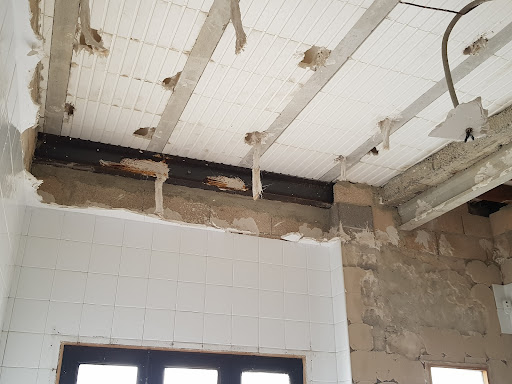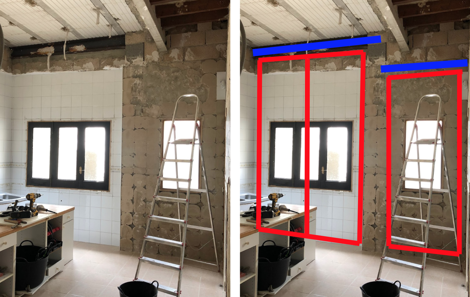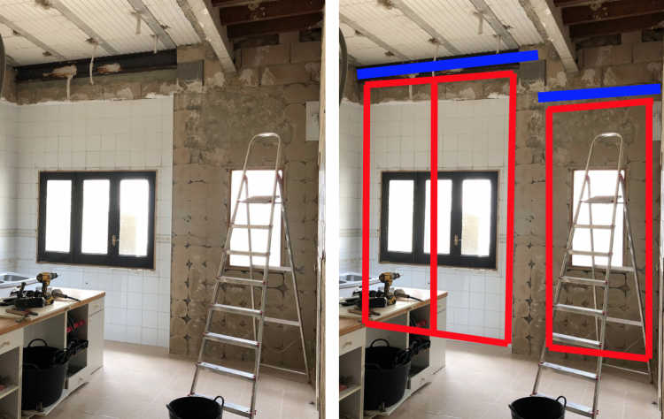 2. 우측의 경우도 벽 일부를 허물고 전면 통유리창을 설치하려 하기에 파란부분에 상인방을 삽입 후 설치하고자 합니다. 천장에 직각으로 지나가는  콘크리트 I빔 바로 아래 벽돌 다음 라인에 맞춰서요. (오른쪽 파란부분 표시) 1번 질문과 마찬가지로 그렇게 상인방 설치 후 바로 창호를 맞닿게 설치해도 괜찮을지 다른 고려할 것이 있을 지 조언 부탁드립니다.