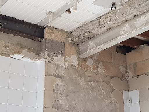 벽의 가운데 부분을 제외하고 허물고(보시면 타일이 있는 부분과 타일이 없는 벽 부분이 곧바로 연결되지 않고 깊이 단차가 있습니다. 가운데 시멘트벽돌 있는 부분이 더 두껍구요. 짙은 시멘트 벽돌 부분이 H빔을 떠받치고 있는 영역입니다, 그림의 빨간 부분에 PVC 창/문 설치를 고려중입니다.