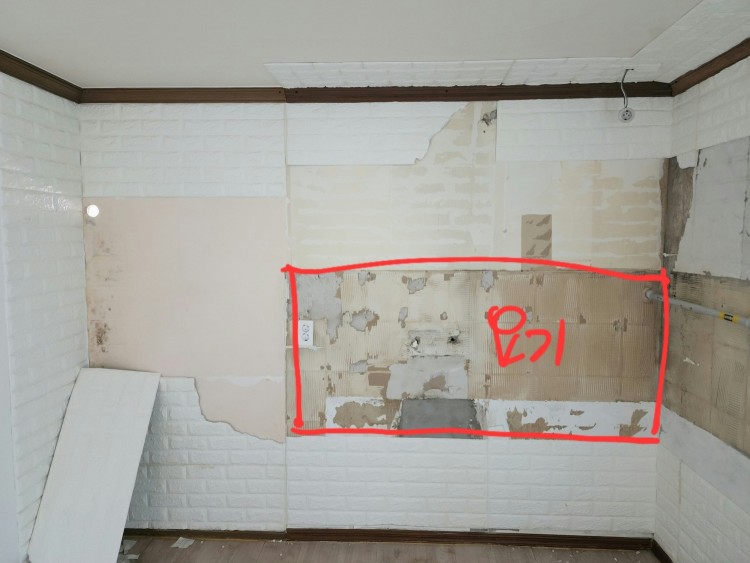 문제는 상태가 불안해 구멍을 뚫어봤더니 뒤쪽 콘크리트 부분이랑 2cm정도의 틈이 벌여져 있었습니다.