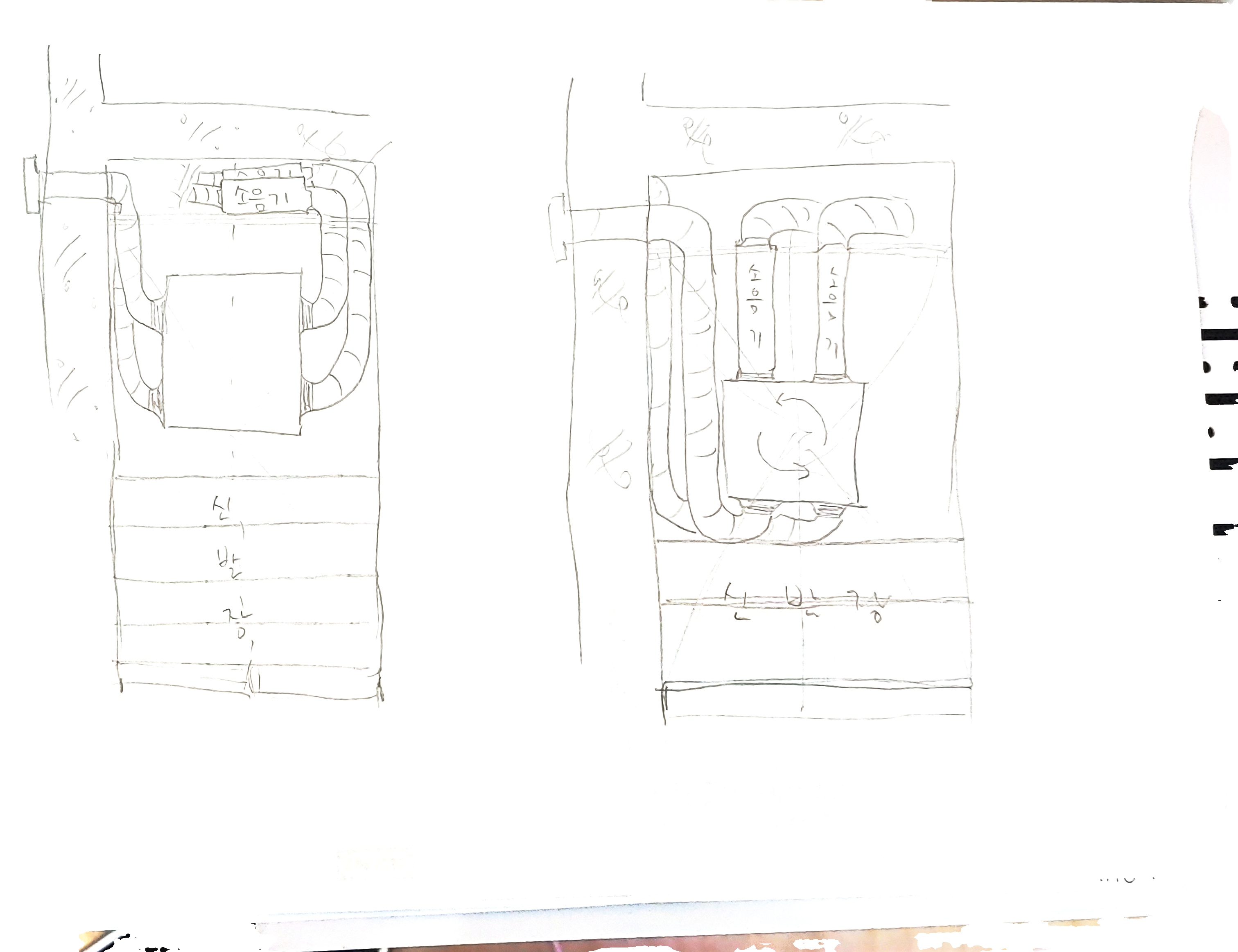 2. 환기장치의 효율과 풍량확보를 위해서는 분배기의 위치는 집의 중앙부분이 유리합니다. 분배기가 중앙에 위치하지 못하기 때문에 분배기로부터 먼 곳에는 배관이 2개 가야합니다.