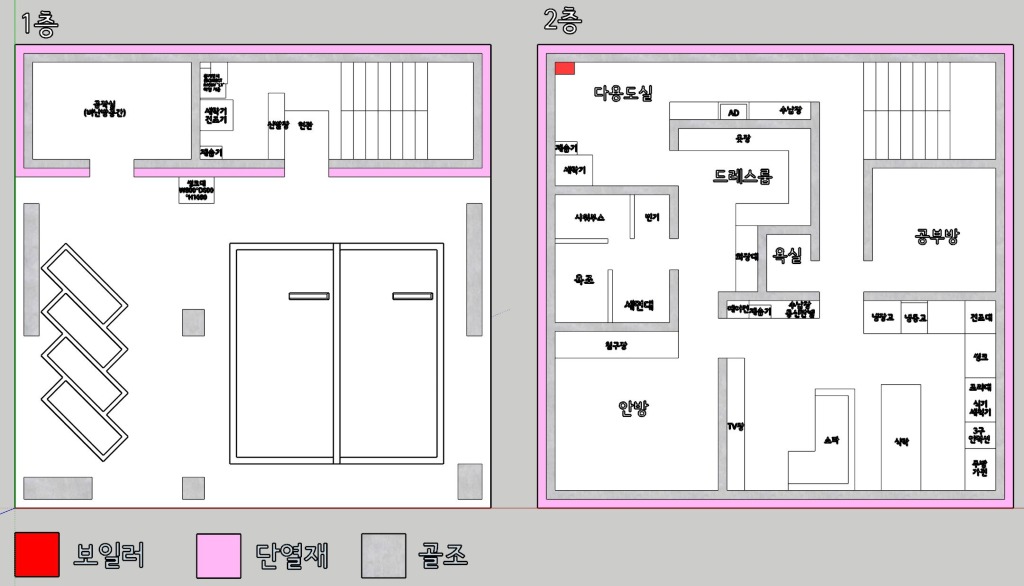 보일러를 1층 공작실로 옮겨 보았습니다. 1층 공작실은 비난방공간, 2층과는 별도의 기밀구역이나, 열적으로 분리되어 있지는 않습니다. 이 위치의 장단점은 2층과 정반대일 것이라 생각합니다.