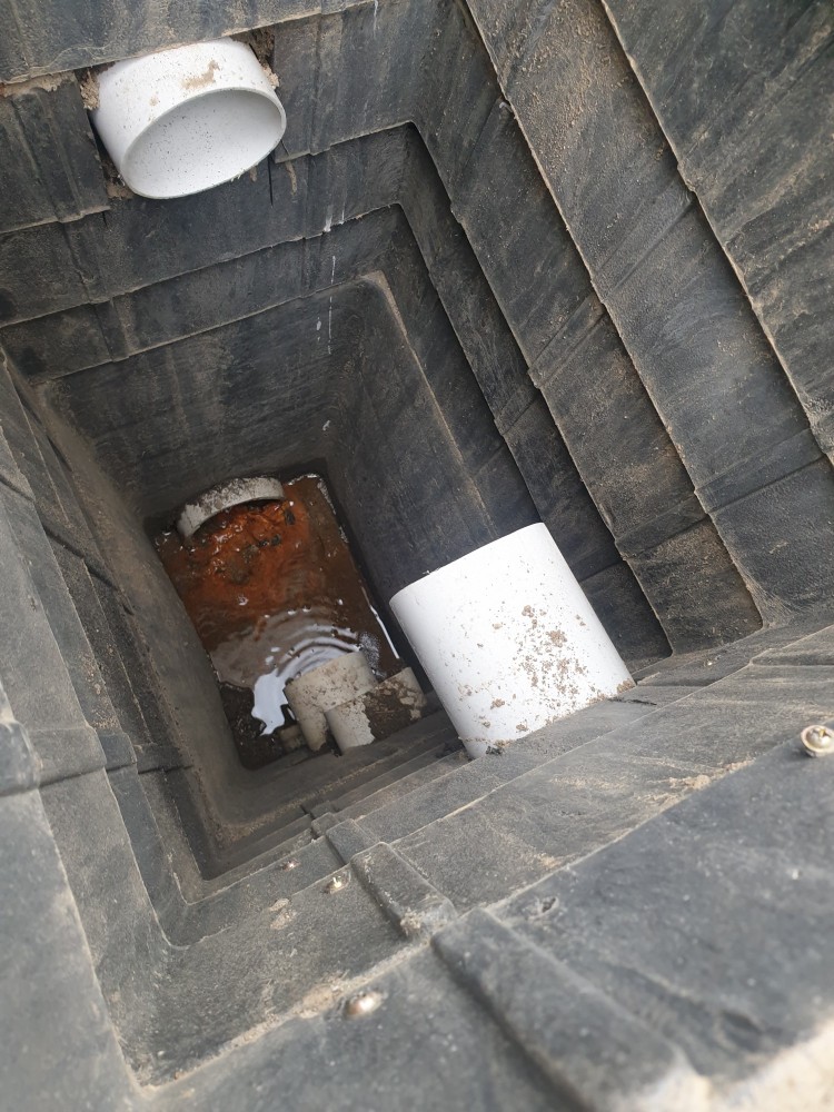 주택에서 구거로 배출되는 최종 집수정내 유출관이 집수정 바닥에 붙어서 설치되었습니다
