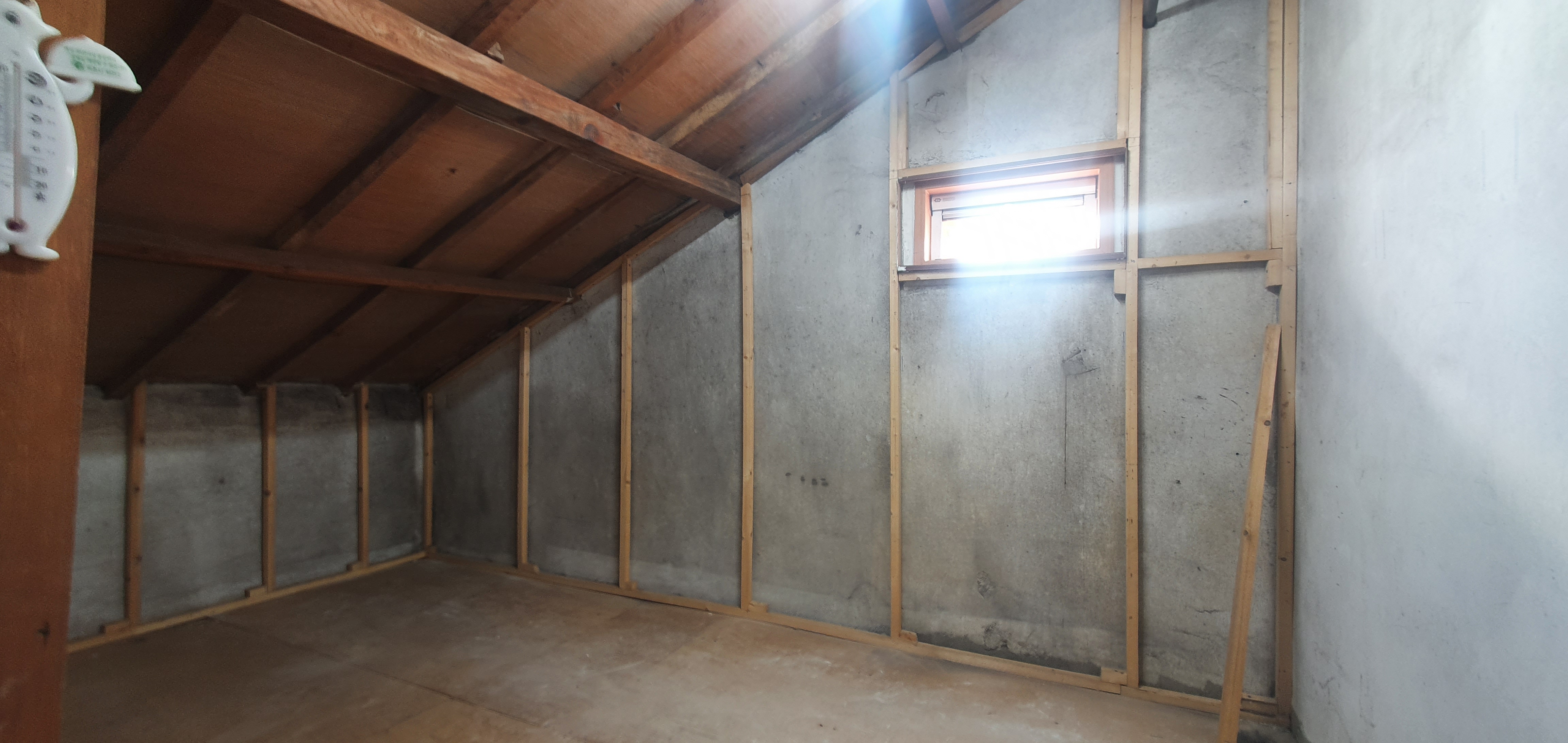 3. 위의 벽돌벽 한쪽에 다락이 존재합니다. 다락 천장(박공지붕 일부)도 단열은 하면 안되겠지요? 내부통기지붕 형식은 힘들 듯 합니다. 사진 첨부합니다.