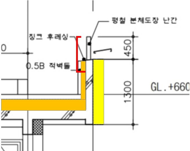 다만 지붕의 난간대의 고정은 파라펫의 내부 쪽에서 옆으로 고정되는 것이 장기적인 누수를 막을 수 있습니다. 그리고 파라펫의 안쪽에 그려져 있는 적벽돌의 안쪽에도 단열재를 넣는 것이 좋습니다.