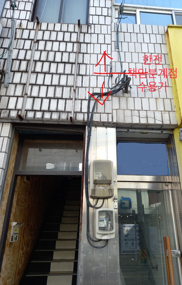 현재 벽부 책임분기점 애자에서 시작된 회로는 계량기를 거쳐 건물 골조속으로 들어가는 것까지 확인할 수 있습니다. 2차에는 분전함에 도달하는 것으로 보입니다.