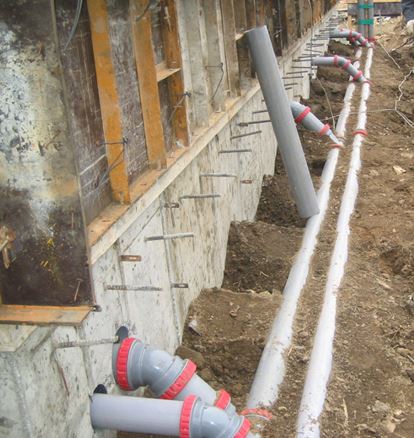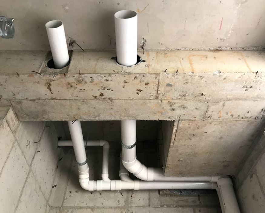 타공 사이즈에 맞추어 매립용 배관을 재단하여 고정시킨 뒤 타설합니다. 정확한 사진이 없지만 이해하실 수 있을 정도의 사진을 첨부합니다. 첫 번째는 기초 사진이지만 원리는 비슷합니다. 두 번째 사진은 천정보를 관통하는 배관 사진인데 자세히 보시면 사전에 미립 매립된 PVC관이 보이실 겁니다.