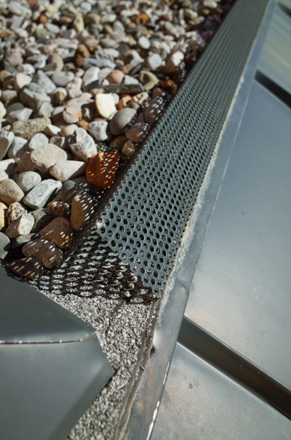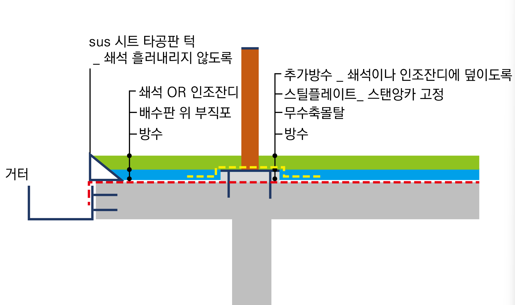 2.SUS 타공 시트로 테두리를 만들고 턱을 형성하여 쇄석이 흘러내리지 않도록 하고, 거터 방향으로 물을 흘려보내도록 계획했습니다. 이 방식이 괜찮을지, 혹시 보완이 필요한 부분이 있다면 조언 부탁드립니다.