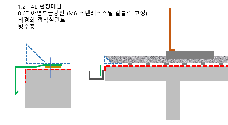 지붕의 끝에 삼각형으로 높이 약 150mm 정도로 삼각형의 방수턱을 만들고, 방수를 경사면을 따라 치켜 올린 다음에, 그 위에 접착실리콘과 칼블럭을 이용해서 아연도금판을 접어서 고정을 하는 방식입니다.