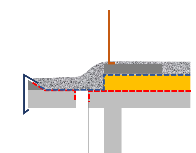방수턱이 있으므로, 배수구는 돌출 처마 쪽을 타공하여 우수관을 매립하고, 단열재 + 부직포로 시공된 다음, 그 위에 경계석을 엊고 난간을 고정하는 방식입니다.