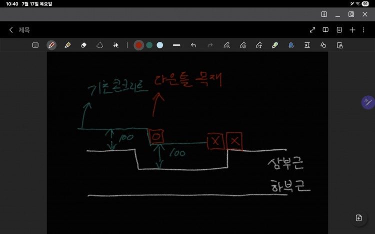 피복두께가 확보되지 않아 다운틀 목재를 띄워서(첨부파일0손그림처의 네모안에 동그라미 그려진 부분)