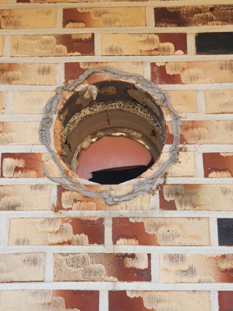 다만 현재 구성이 판넬-EPS단열재-벽돌 의 순서로 보이는데.. 처마가 있다면, 벽돌 쪽의 구멍을 아래와 같은 루바형 스텐후드캡을 사다가 막으시는 것이 좋고, 처마가 없다면 좀 복잡해 집니다.