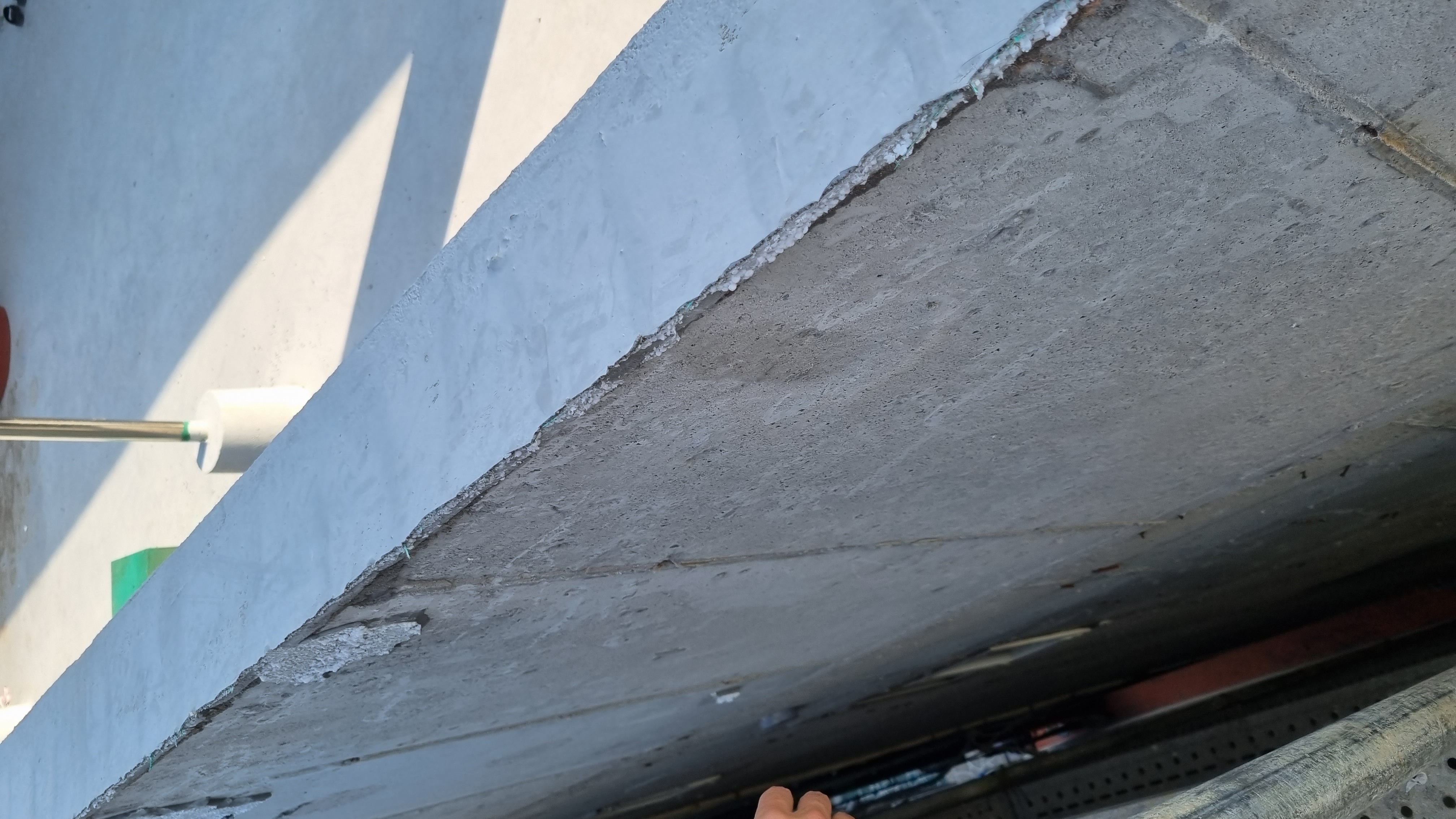 외부 단열재가 철거된 파라펫 면입니다. 콘크리트 면 위로는 메시가 들어있는 몰탈면이 안쪽 벽으로 감겨 이어지고 있습니다.