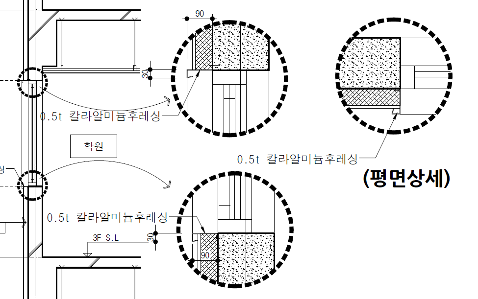 4. 구조체와 창호의 끝선이 서로 같은 수직선 상에 있다면 별도의 후레싱은 필요로 하지 않습니다. 후레싱은 창호가 구조체 보다 돌출되어 있는 경우에 창틀의 상부에 고이는 빗물을 처리하기 위해서 존재를 하기 때문입니다.