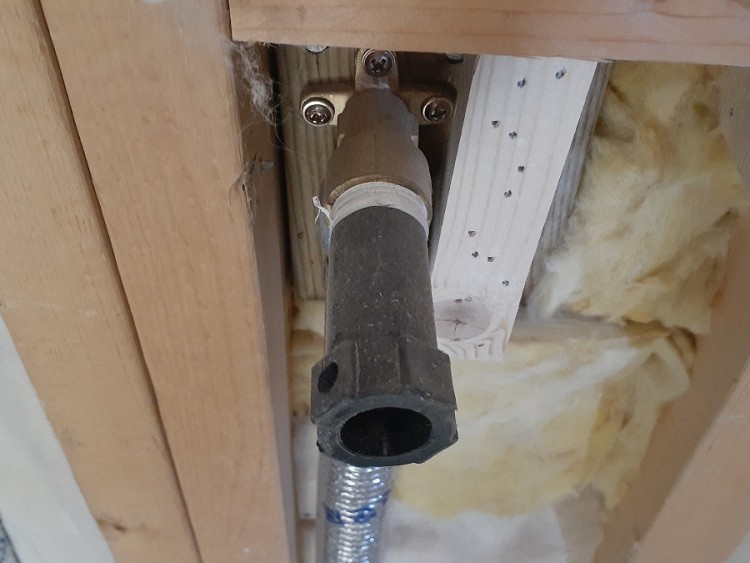 (1) 첨부된 첫번째 사진은 욕실의 스터드사이에 단열재와 수도배관이 시공된 모습입니다.