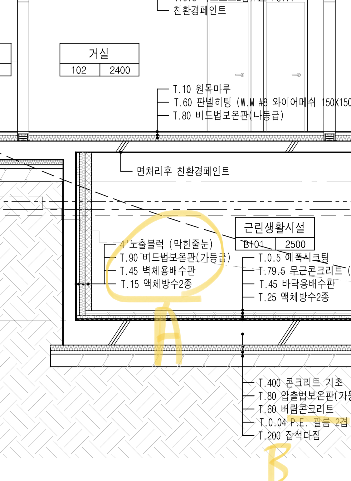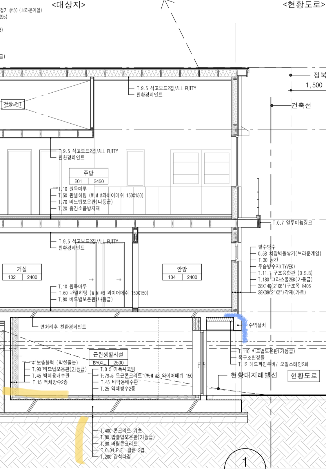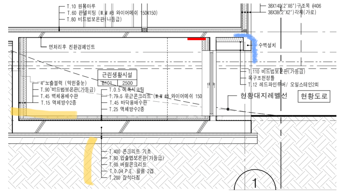 1)관리자님, 기초부분 및 지하층 외방수 외단열을 어떤 구조로 하면 좋을까요? (첨부한 사진에서 노란색 부분 보시고 지적 부탁드립니다.)