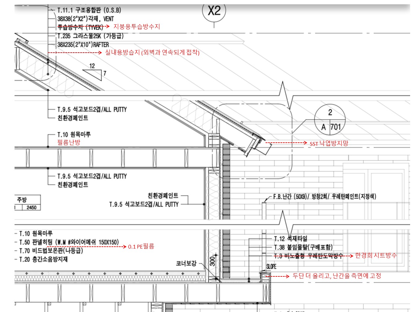 징크->방수멤브레인(toples95)->T3 쉬트방수->구조용합판osb->2x2벤트->투습방수지(타이벡)->2x10(글라스울)...