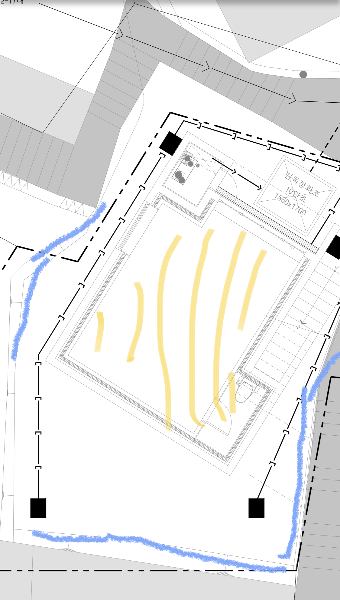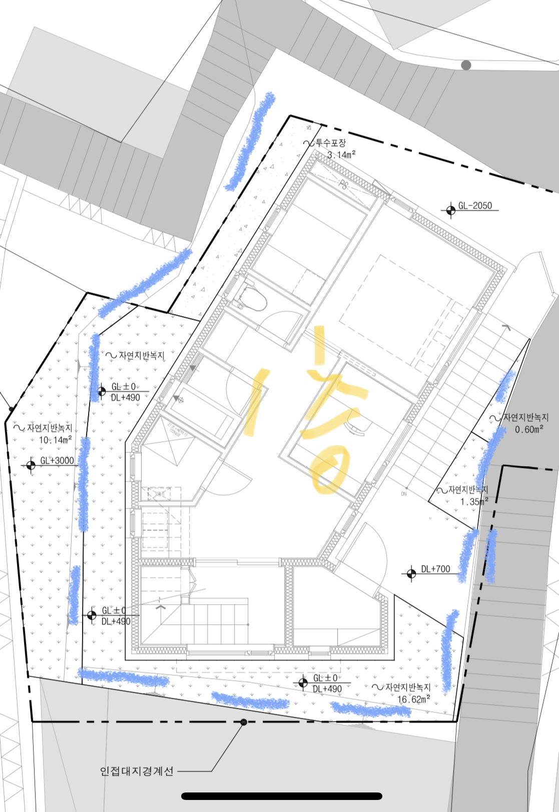 첨부한 우수관도에서, 파란색이 현황옹벽선이고 노란색이 지하층입니다. 삼면으로 여유가 있진 않은데요..그래도 외방수 외단열을 하려면 작업은 가능한 공간이 나올 것 같은데 건축사님은 현장상황을 봐야할 것 같다고 하시더라고요. 혹시 지하층 외벽 기준 외부공간이 어느 정도 있어야 외단열 외방수가 가능할까요? 어떤 분은 벽체와 비율이 1:1이라고도 하시고 어떤 분은 몇십센치만 돼도 가능하다고 하시더라고요.